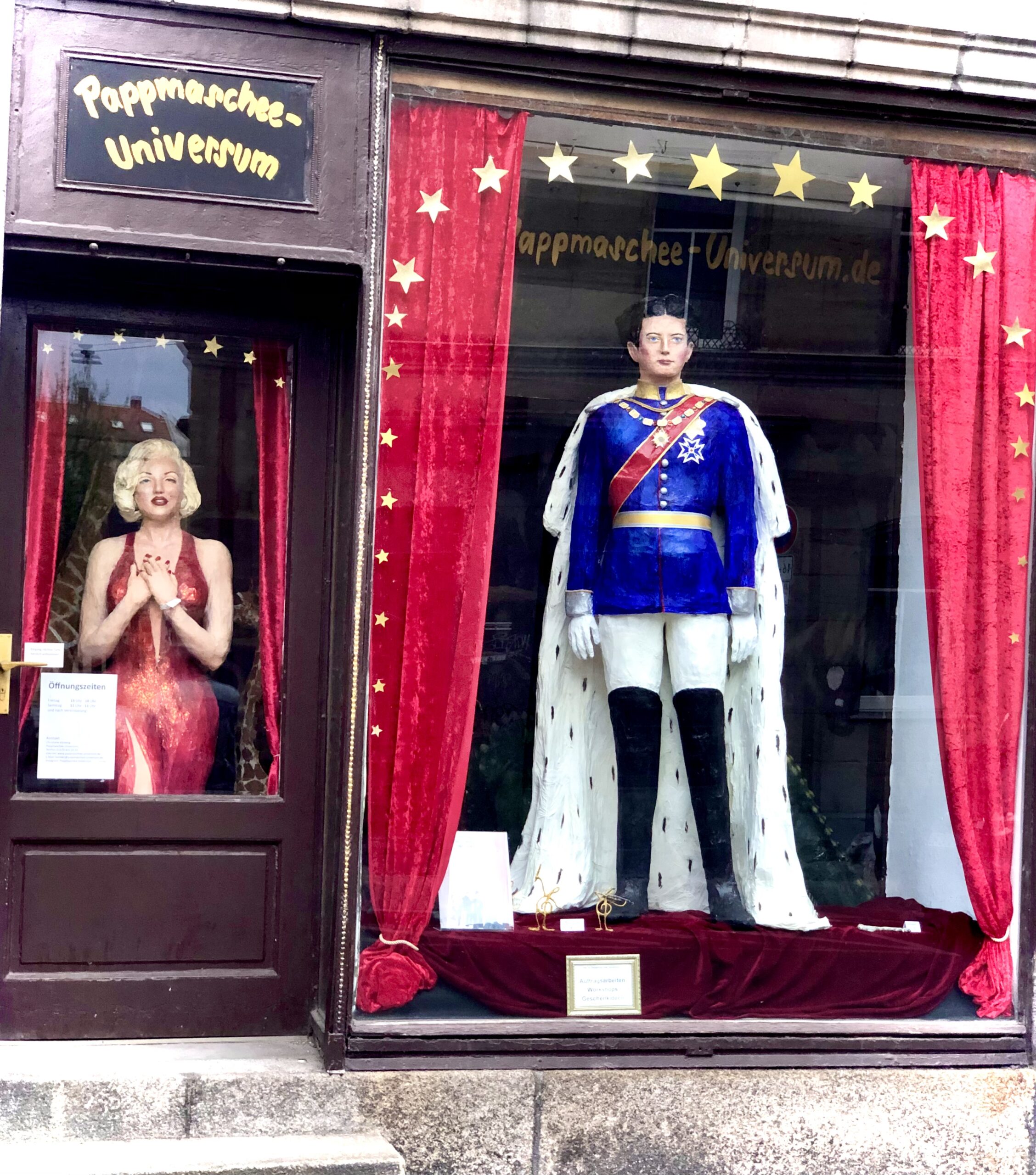 Im Pappmaschee Universum Atelier (Theaterstraße 20 in 90762 Fürth/Bayern) finden Sie lebensgroße Nachbildungen von Marilyn Monroe, Charly Chaplin und weiteren bekannten Persönlichkeiten. Außerdem ist hier eine große Vielfalt an Tieren aus Pappmaschee, so z.B. Erdmännchen, Hunde, Katzen, oder Eichhörnchen. Für Ballett- oder Musikfreunde gibt es Balletttänzer und Balletttänzerinnen, Notenschlüsselmännchen zum aufstellen oder Noten aus Pappmaschee. Und vieles mehr, lassen Sie sich überraschen! Kommen Sie und blicken Sie durch die großen Schaufensterscheiben des Ateliers.