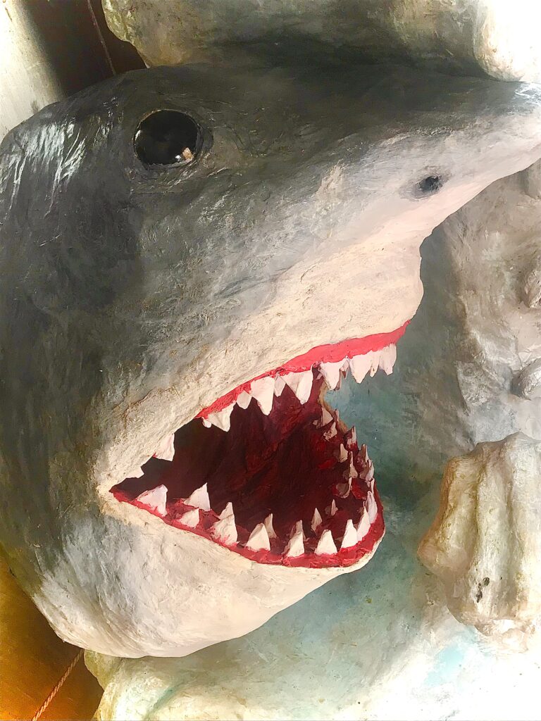 Haikopf mit Wandaufhängung und stabiler Holzrückplatte, 60 cm hoch, Preis 750 Euro. Der Haikopf auf dem Foto ist bereits verkauft, kann aber gerne wieder angefertigt werden, auch in anderen Größen. Selbstverständlich können Haie auch in kompletter Körpergröße angefertigt werden, alle Größen, egal ob Katzenhai oder Riesenhai.