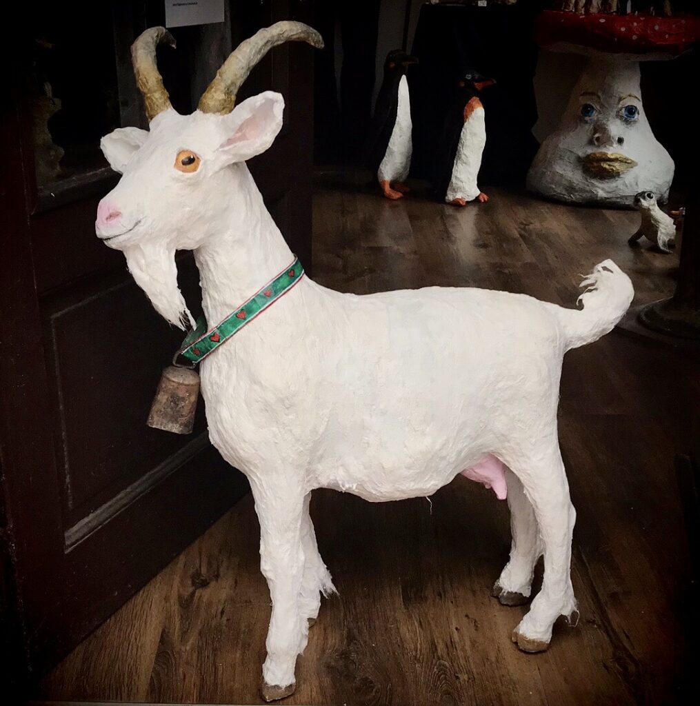 Ziege, lebensgroß, mit Glocke, Preis 750 Euro. Die Ziege auf dem Foto ist bereits verkauft, kann aber gerne wieder angefertigt werden.
