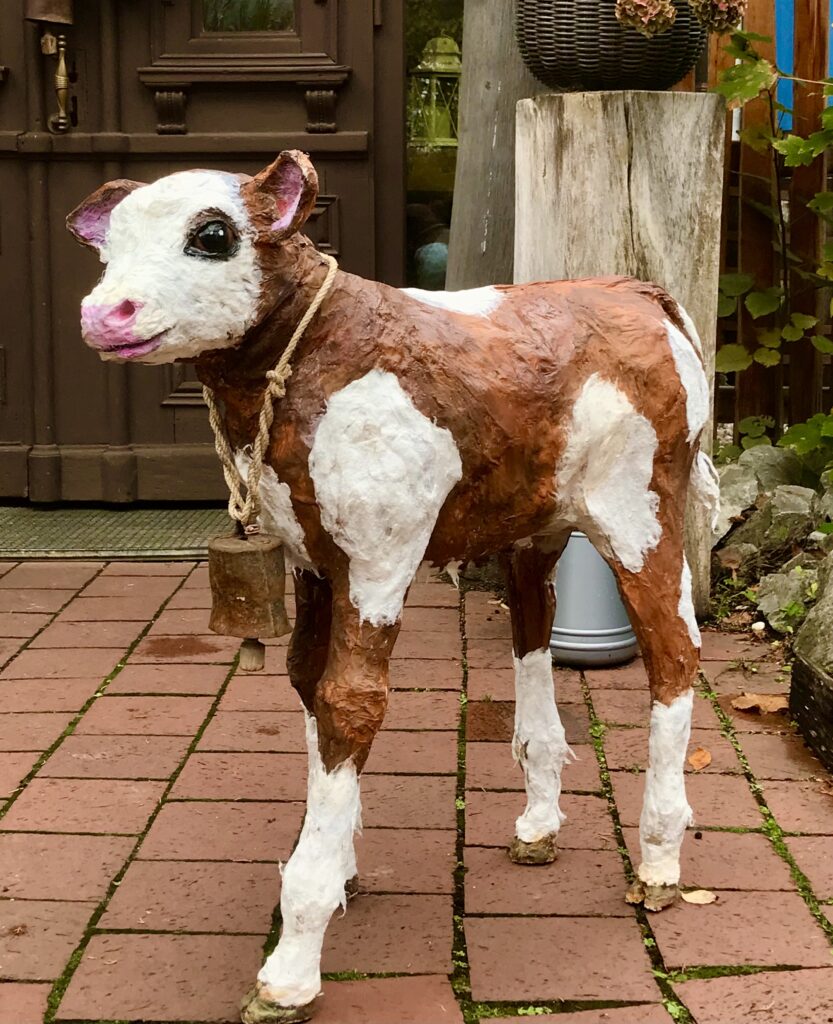 Kälbchen, zur Zeit ausgestellt im Bio-Landhotel Moarwirt Dietramszell/Hechenberg (Nähe Starnberger See). Die Ausstellung war sehr kurzfristig, deshalb fehlen noch ein paar Pinselstriche, die ich bei Verkauf nachtragen würde. Preis 750 Euro. Selbstverständlich werden im Pappmaschee Universum nicht nur Kälbchen hergestellt, sondern auch ausgewachsene Kühe, Stiere sowie alle anderen Tiere in allen Größen.